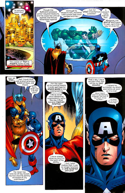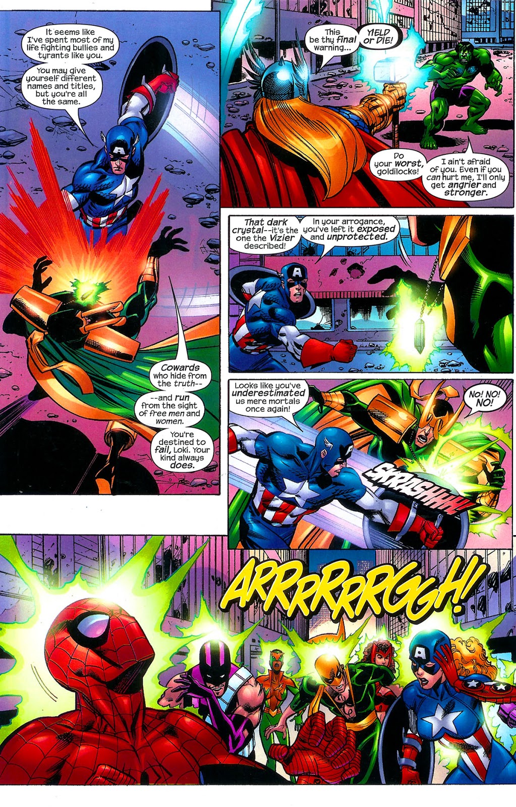 Thor transports the group of heroes back to Earth to confront the Hulk and find Loki. When Spider-Girl reveals Loki, Captain America confronts him as Thor battles the Hulk. Loki's spell is almost sealed by the spilling of fatal blood when Thor nearly kills Hulk. But thanks to Captain America breaking Loki's spell by destroying his dark crystal at the cost of his own life, the day is saved.