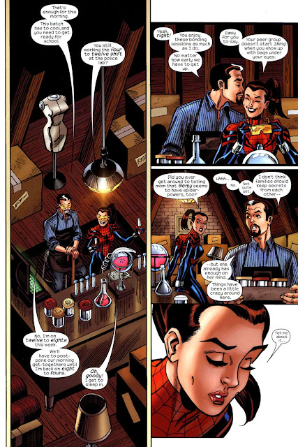 The Parker’s attic is, somewhat fittingly, a reoccurring location of some significance. It’s where Mayday learns of the events surrounding her father’s final battle with the Green Goblin and the loss of his own leg. It is also where Mayday finds her Uncle Ben’s costume and web-shooters before heading out to save her father (What If #105/Spider-Girl #0). Mayday would return here on occasion to seek a costume (Spider-Girl #7) and eventually Peter would teach his daughter to make web-fluid there using a makeshift lab (Amazing Spider-Girl #20).